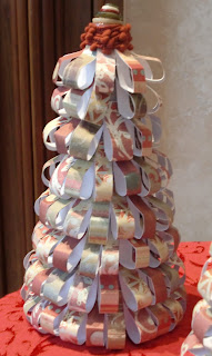 Next I got out a Styrofoam cone. After gently folding the paper strip in half without pinching the folded end, I started attaching them to the bottom of the cone with pins. I continued doing this all the way up the tree until I got almost to the top of the cone. Once I finished attaching the paper strips, I got out some ribbon and wound it around the top covering the last row of pins in the paper. Finally, the last step is to top off the tree with buttons. I actually pinned down the bottom button and then glued the others to that button. If you have long pearl pins you could just pin the stack of buttons to the top of the tree.