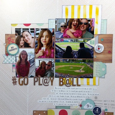 This sketch had me stumped for a minute, because I don’t have any printed photos in these sizes, so I decided to see what I already had printed small enough to work. I found these of my daughter’s first time at a baseball game last spring, but the sizes were off and I had too many. Well, this is why sketches are perfect…you don’t have to follow them exactly. I keep the feel of the pictures the same, but added an extra patterned paper layer behind the photos on the right side to give it more visual weight like the sketch. After adding lots of different pieces of patterned paper and all my photos, I really loved how it all came together. For the lists I ended up adding: Dark Pink and Dear Lizzy, Ebony Ink and Echo Park, Fawn and Flair.